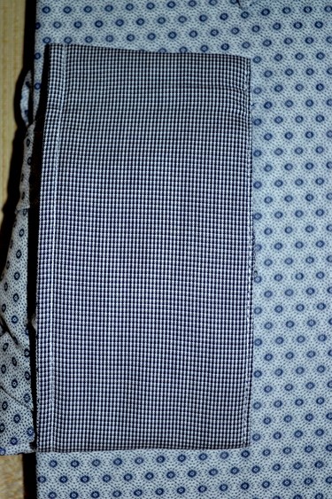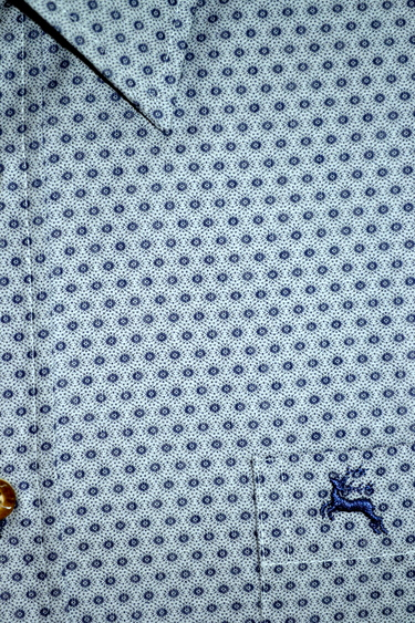 High quality fine Turkish cotton shirt in a funky navy blue dotted small print with contrast micro-check cuff and collar lining. Faux horn buttons.