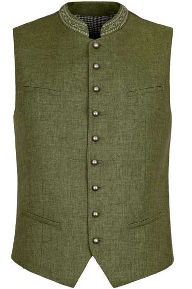 Linen vest in traditional mossy/olive green linen features embroidered stand-up collar, metal buttons, and slash pockets. Fully lined in white/dark green checked acetate; with an inside pocket on the left chest.