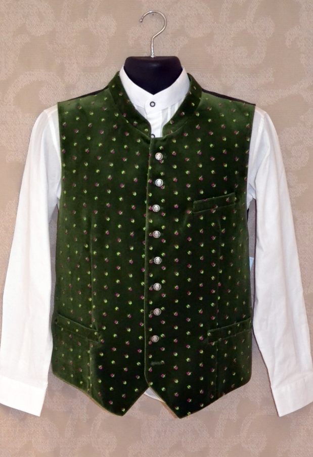CLEARANCE 40% OFF NOW $120.00rrTraditional vest with a modern twist. Oberkrainer style in velvet with embroidered flowers in modern, trending bright green. Floral accents are magenta and white. Fully lined. Acetate back with sliding buckles and tabs to adjust waist.rrProfessional clean only. rrSized to fit men of average height 5’9″ to 6″0″ tall.