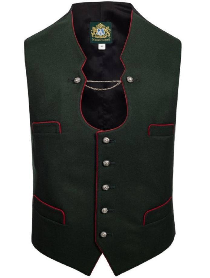 Traditional Miesbacher style vest, in dark green 80 % wool/20% poly blend. Red piping trim, front facing, metal buttons, and chain/button closure accent.
