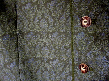 Subtle colour combination of loden green and blue, the brocade fabric has a slight texture and subtle sheen. The lapels are the same brocade fabric as the vest; while the collar is solid loden green, as is the pocket facing and piping. Horn buttons add a traditional touch. Back is solid black with 1/4 belt to adjust the fit.