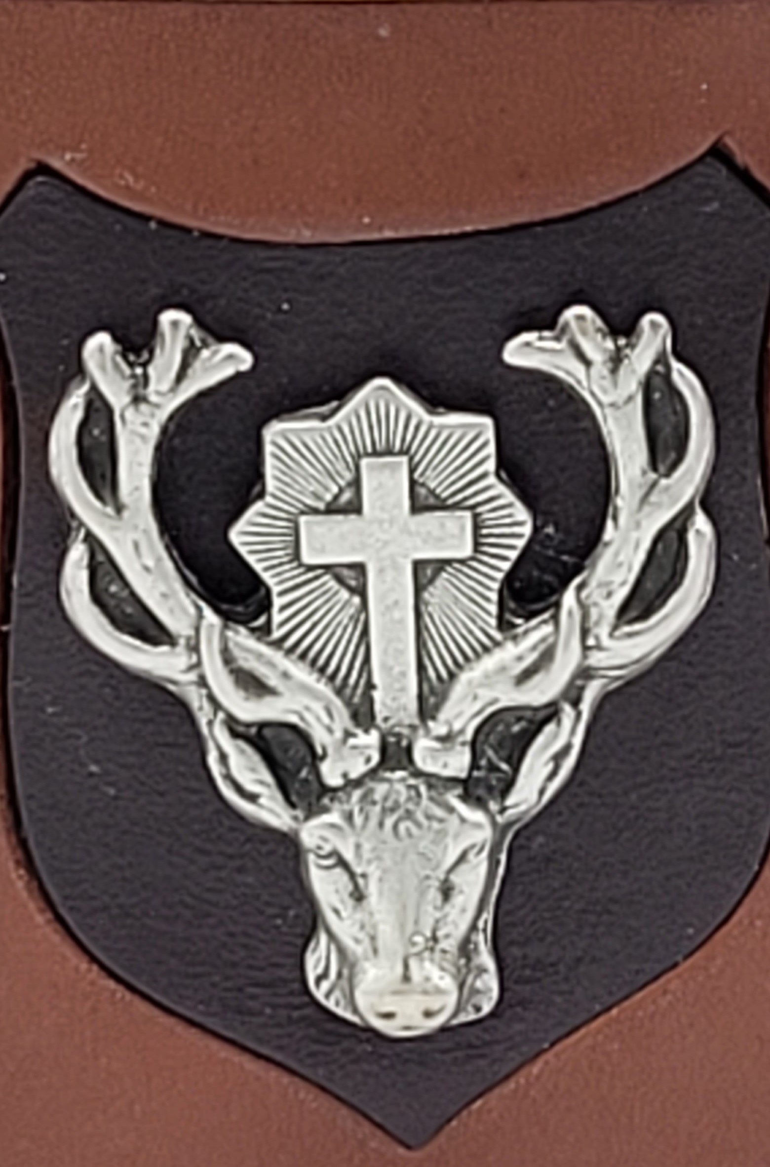 Men’s 5 oz capacity flask is wrapped in brown leather with darker brown leather central inset which highlights the dimensional metal applique of the hubertus deer, a traditional Bavarian motif.ย Makes a great gift for the sportsman, or for groomsmen – along with a bottle of herbal liqueur!