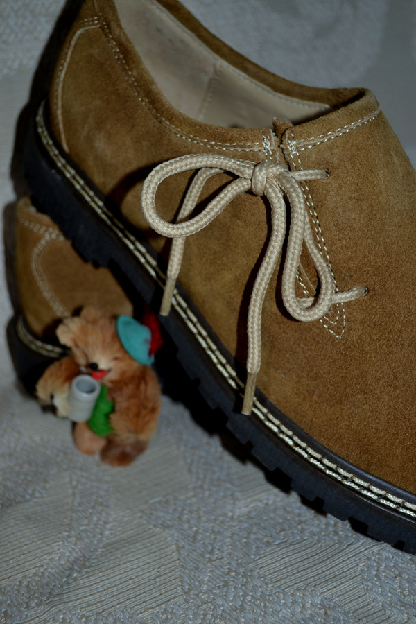 Traditional trachten shoe in light tan suede features heavy sole, contrast stitching and side opening/laces. rr Commonly worn with lederhosen, many have found them so comfortable they wear them with jeans and casual pants all year long. Fits average width (C-D) man’s foot.