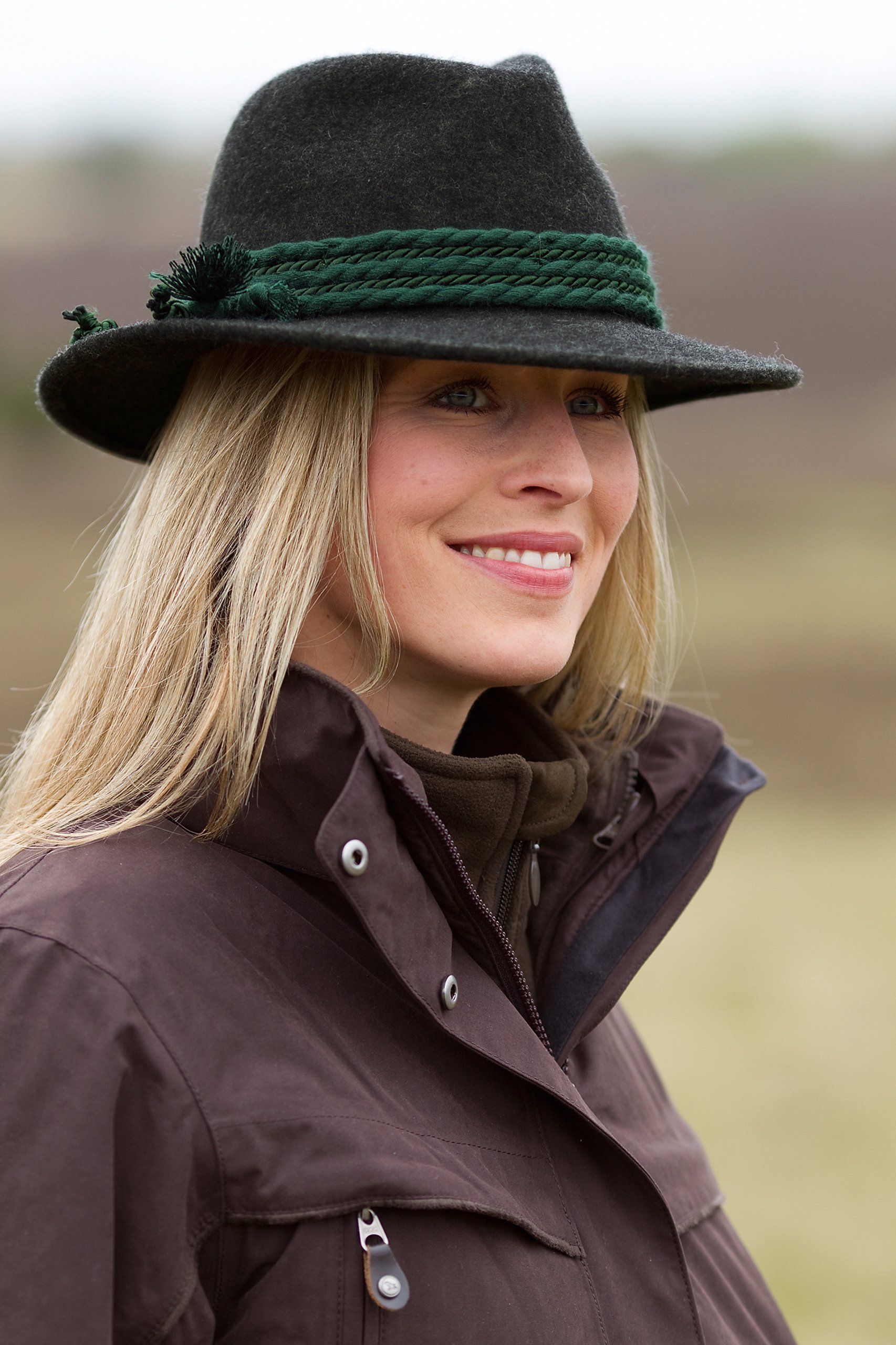 High quality wool felt hat made in Germany.ย  Unixex styling with flattering narrower brim with standard height crown.ย  Several alternating rows of traditional dark green cording in two thicknesses add interest and texture.