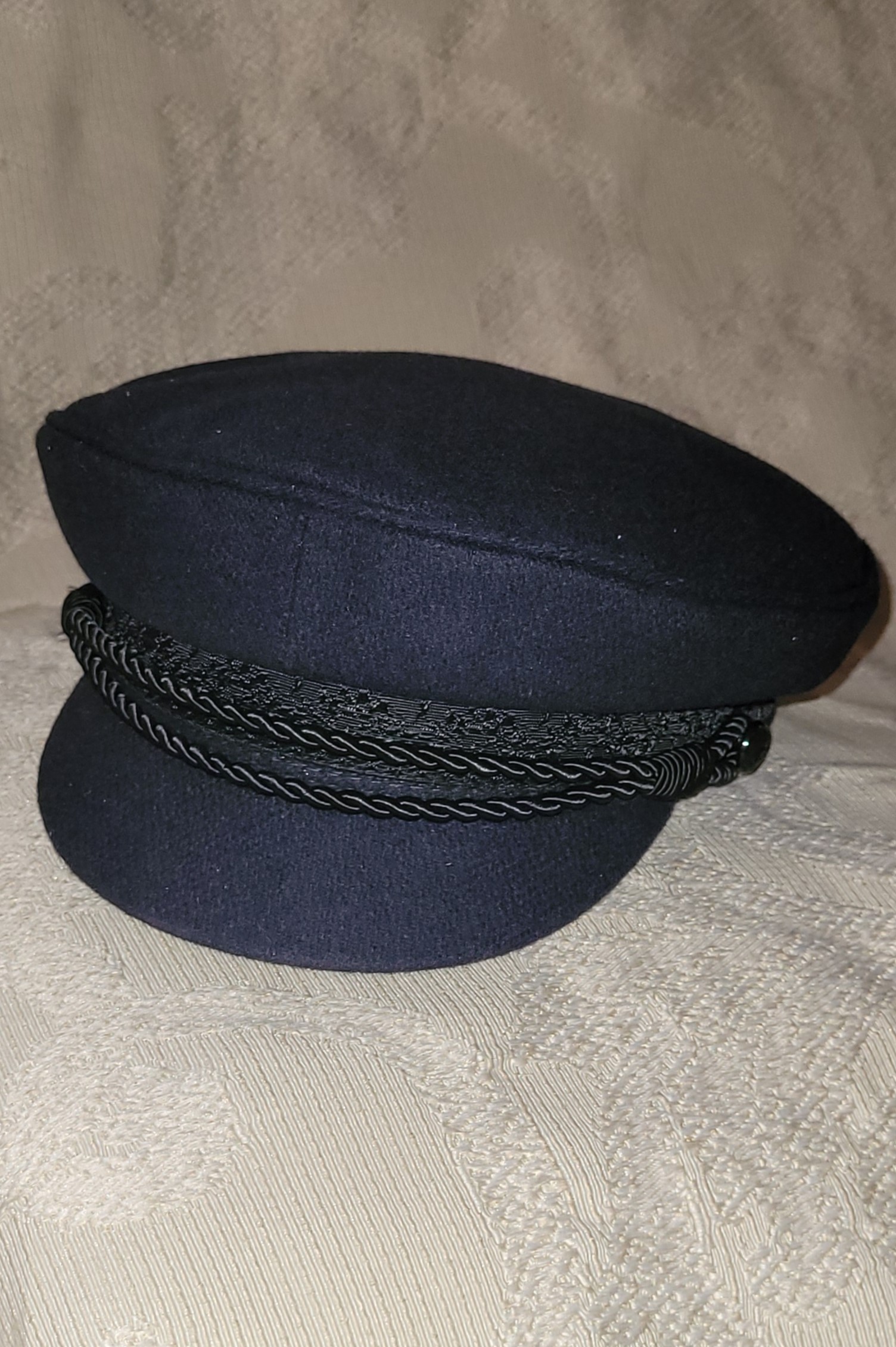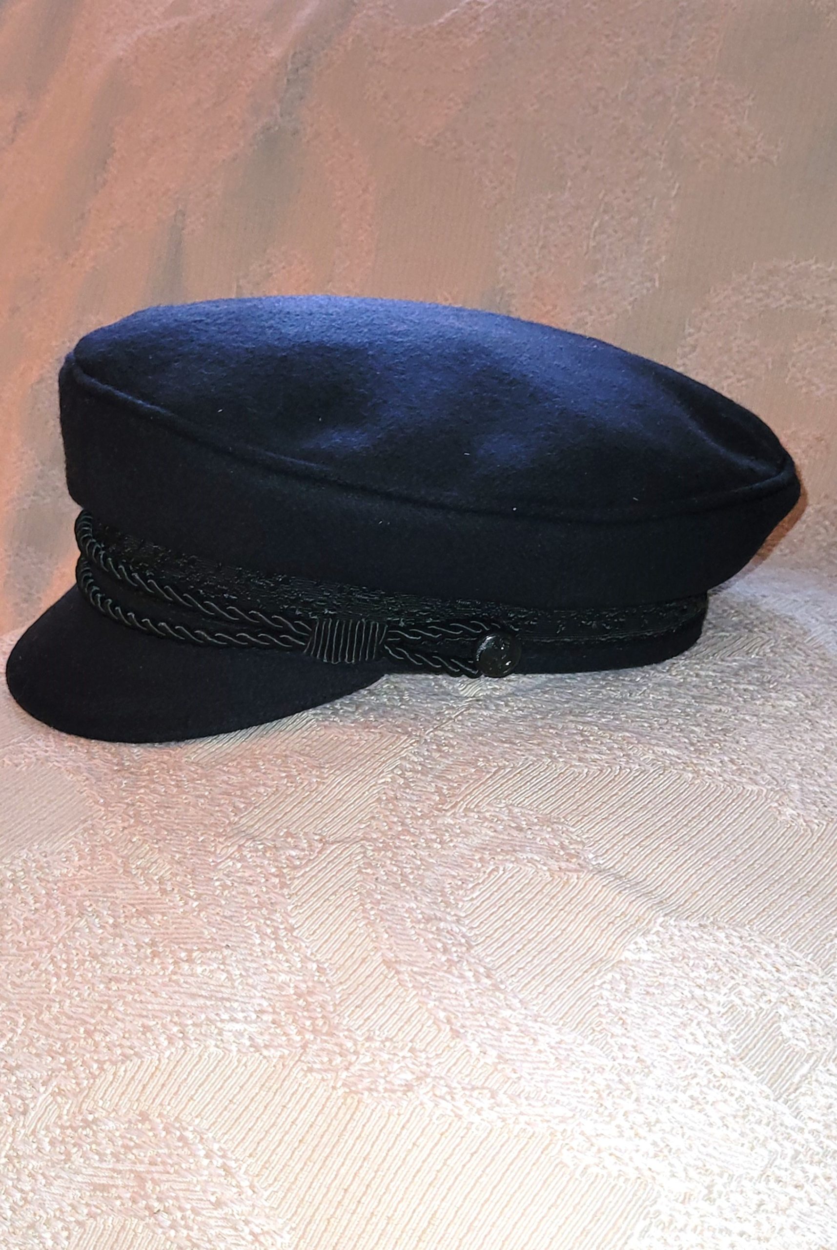 The traditional hat worn in areas of Northern Germany along the Elbe river.ย Navy wool, with reinforced shallow peak, with braid trim .