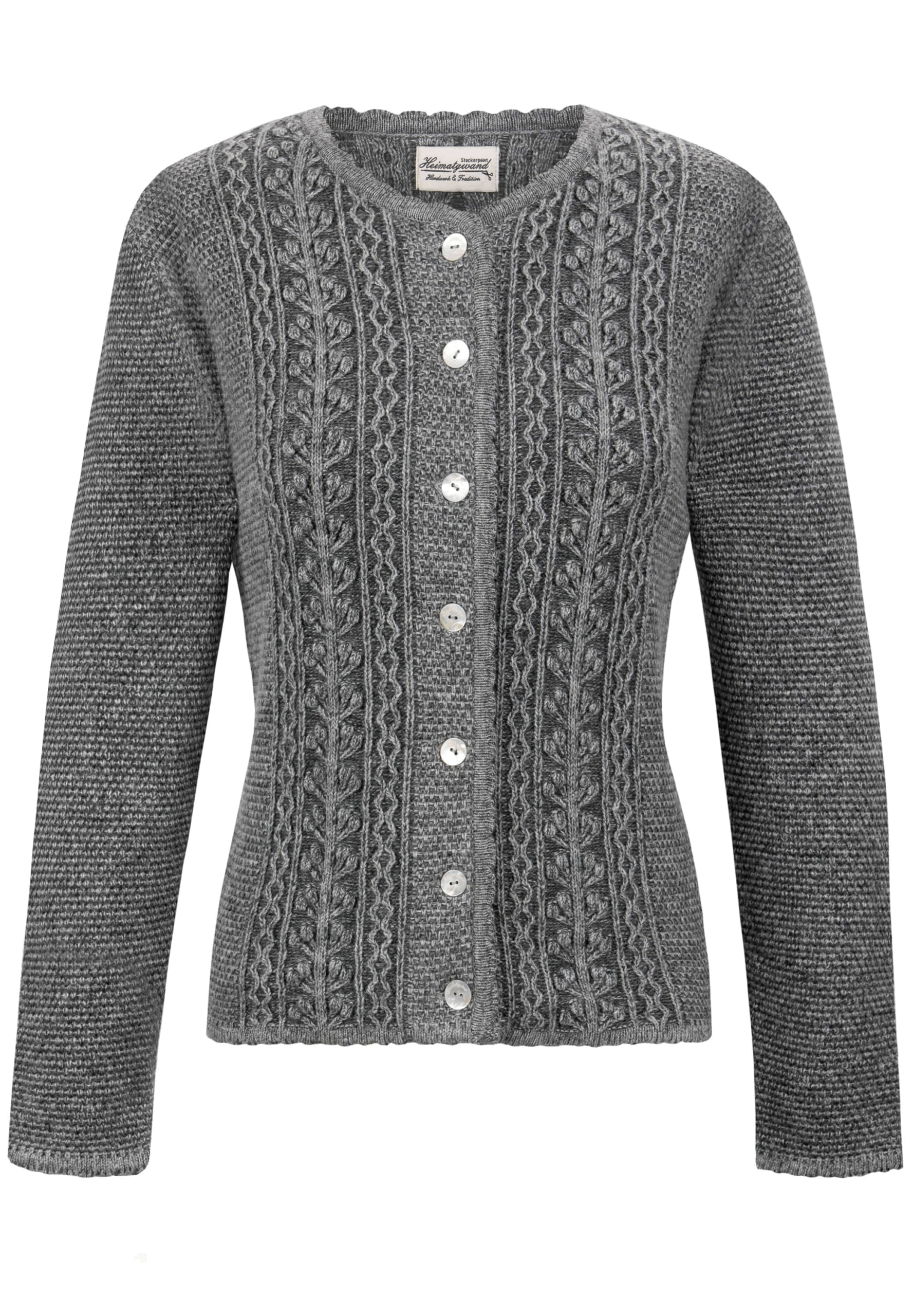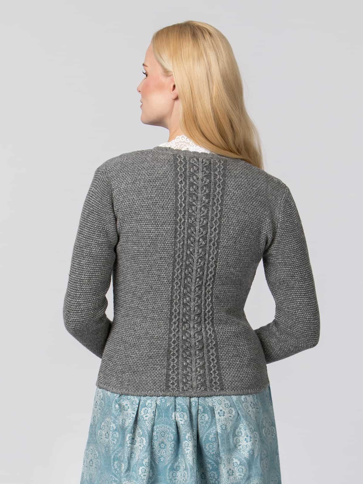 Shorter length sweater in a neutral medium-grey colour is perfect over a dirndl, but also works with skirts or pants on those days when you need an extra layer.ย Vertical dimensional vine motifs on the front provide interest and is used again on the centre back.ย Round neckline, cuffs and hem have a scalloped profile.ย Mother-of-pearl buttons.ย ย 80% wool; 20% acrylic.