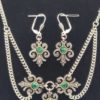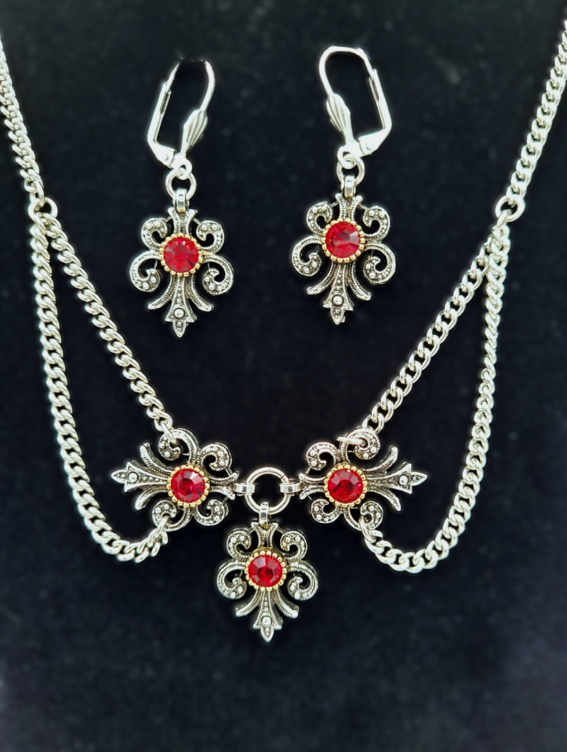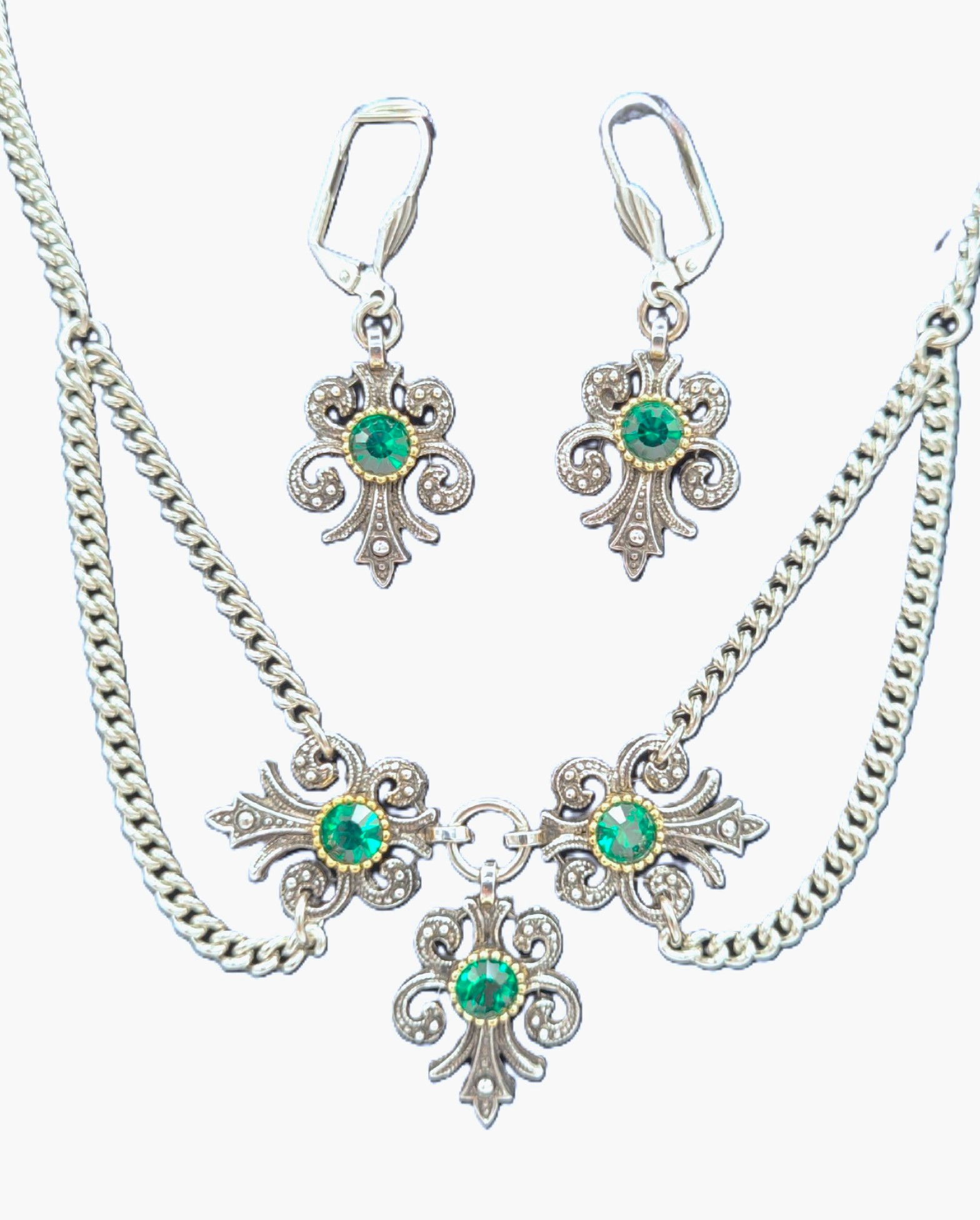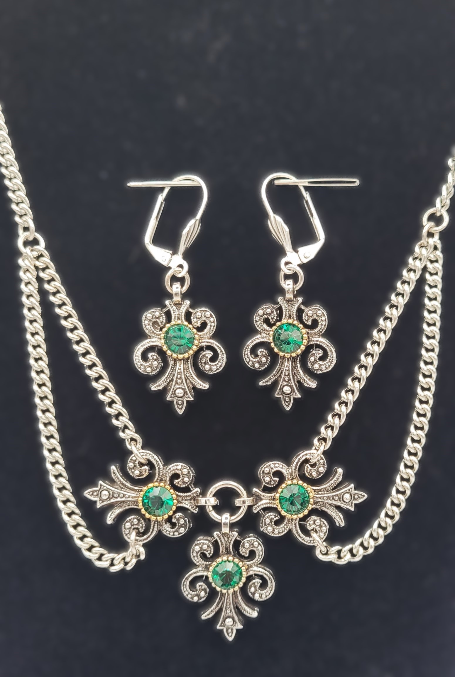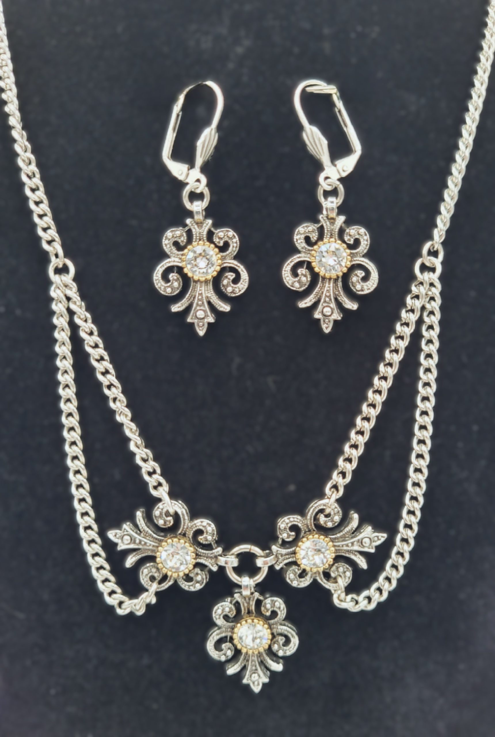 Gorgeous traditional necklace features a trio of beautifully cast scrolled antique silver settings, each set with a round brilliant-cut Swarovski crystal.ย Matching earrings for pierced ears.ย Cast and hand-assembled in Bavaria by Trachtenschmuck Stephan.ย Matching drop earrings with lever back hooks to keep them securely in your ears.ย Hypoallergenic metals.