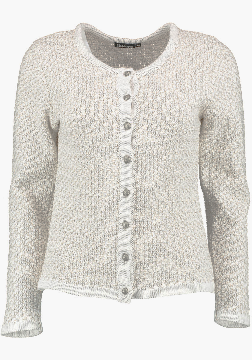 Knitted cardigan in a basketweave pattern in cream and taupe, features metal embossed button front.ย Slightly fitted, and falls at the upper hip on most women of average height and proportions.ย ย Narrow knitted cuffs and hem, banded neckline and reinforced front placket.